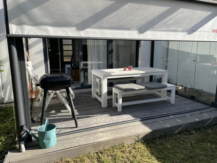 Huis in een rij 4-kamers 120 m2 op 3 verdiepingen. Ruim, modern ingericht: groot woon-/eetkamer met eettafel, bibliotheek en Sat-TV (Flatscreen TV). Uitgang naar het terras. Open keuken (oven, afwasmachine, 4 keramische glas kookplaten, broodrooster, waterkoker, magnetron, elektrische koffiemachine, pads voor de koffiemachine (Senseo Pads) extra). Aparte WC. Bovenverdieping: 1 kamer met 1 2-pers bed (160 cm, lengte 200 cm), bad/douche/WC. 1 kamer met 1 2-pers bed (160 cm, lengte 200 cm). 2e Verdieping: 1 groot kamer met 1 2-pers bed (180 cm, lengte 200 cm), douche/WC en Sat-TV (Flatscreen TV). Uitgang naar het balkon. Verwarming, vloerverwarming. Balkon, terras overdekt, gazon 12 m2. Terrasmeubelen, barbecue (verrijdbaar), ligstoelen (2). Ter beschikking: Internet (WiFi). Parkeerplaats (1 Auto). Rookvrij huis. Rookmelders, brandblusser.