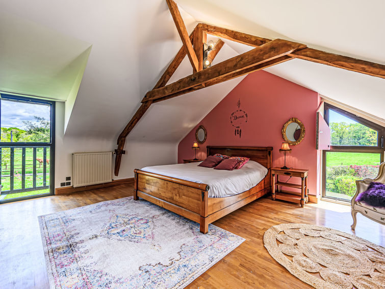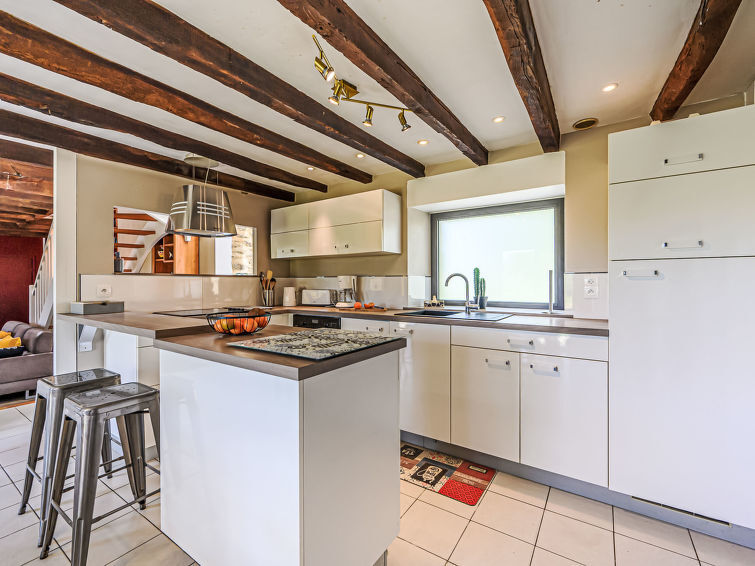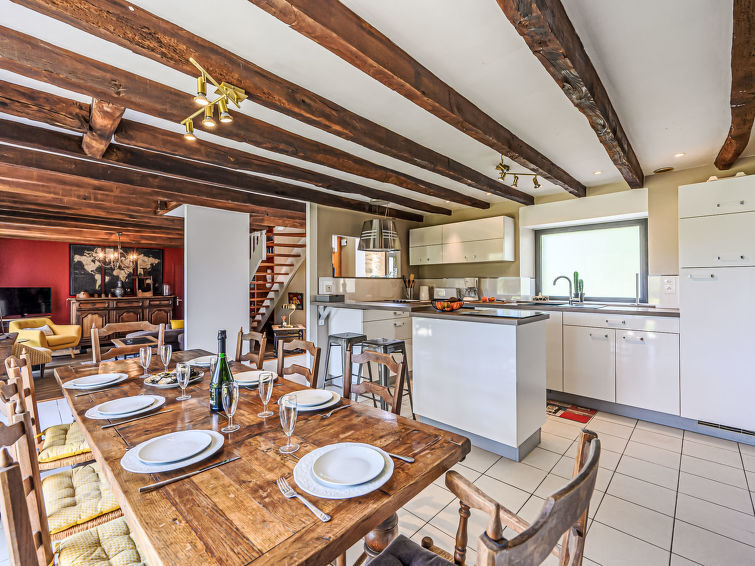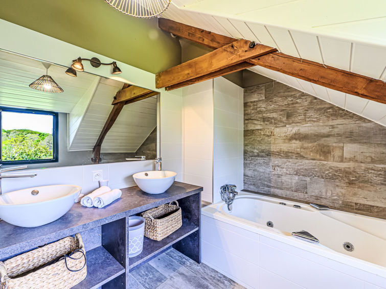 "Karvez", huis 5-kamers 157 m2. Comfortabel ingericht: woon-/eetkamer met TV (Flatscreen TV), tegelkachel. Uitgang naar de tuin. Keuken (3-pits kookplaat, oven, afwasmachine, broodrooster, waterkoker, magnetron, diepvriezer, elektrische koffiemachine). Aparte WC. Bovenverdieping: 2 kamers, elke kamer heeft 2 bedden (90 cm, lengte 190 cm). 1 kamer met 1 bed (90 cm, lengte 190 cm). 1 kamer met 1 2-pers bed (1 x 160 cm, lengte 190 cm), bad. Douche, aparte WC, dubbele wastafels. Aanbod door een particulier volgens art. 155, IV van CGI.