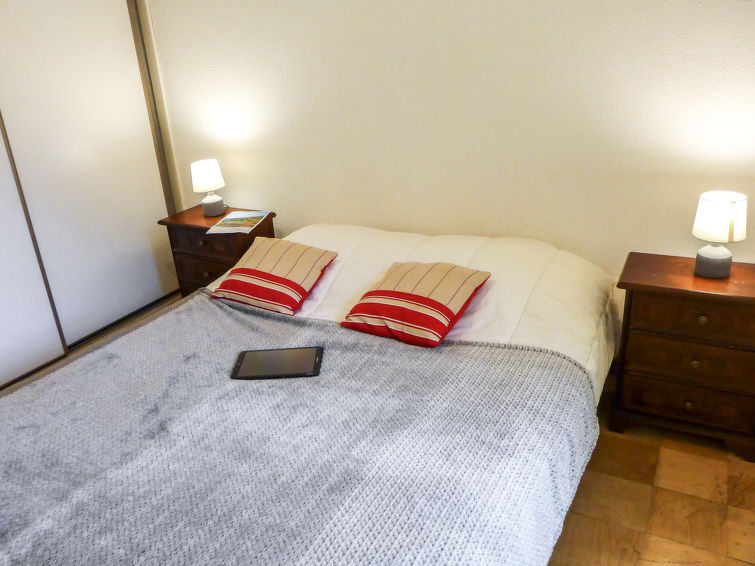 Appartement 2-kamers 42 m2 op de 3e verdieping. Eenvoudig ingericht: woon-/eetkamer met TV. Uitgang naar het balkon. Slaapnis met 1 x 2 stapelbedden (90 cm, lengte 190 cm). 1 kamer met 1 2-pers bed (140 cm, lengte 190 cm). Kookhoek (oven, afwasmachine, 2 keramische glas kookplaten, magnetron, elektrische koffiemachine, pads voor de koffiemachine (Tassimo) extra). Douche, aparte WC. Elektrische verwarming. Balkon, op het noordoosten gelegen. Uitzicht op de bergen. Ter beschikking: wasmachine. Internet (Internet (WiFi), extra). Garage nr. 34 petite voiture. TV alleen FR. Rookmelders. In plaats van een afgesloten slaapkamer bevinden sommige slaapgedeeltes zich in een open ruimte (galerij, nis, etc.). 7405600114019