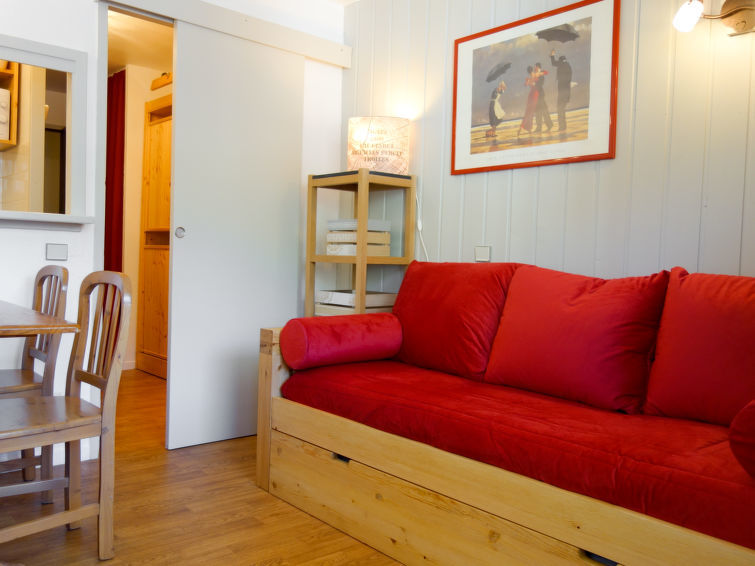 Studio 1-kamer 20 m2 op de 2e verdieping. Eenvoudig en doelmatig ingericht: woon-/eetkamer met 1 uitschuifbaar bed (2 pers. 2 x 80 cm, lengte 190 cm), TV. Hal met 1 x 2 stapelbedden (80 cm, lengte 190 cm). Kookhoek (2-pits kookplaat, afwasmachine, magnetron). Bad/WC. Balkon, op het zuiden gelegen en op het westen gelegen. Panoramazicht op de bergen en de skipiste. Ter beschikking: haardroger. Internet (Internet (WiFi), extra). Let op: niet rokers woning. Rookmelders.